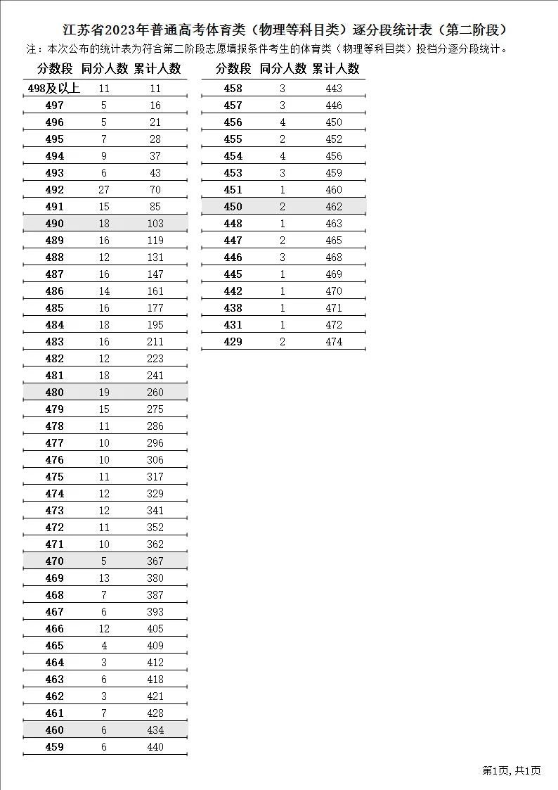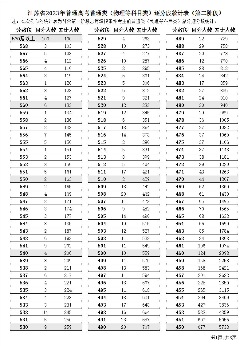 江苏省2023年普通高考逐分段统计表(第二阶段)