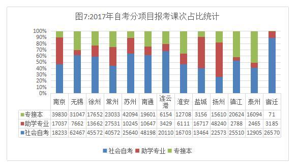 5.报考课次分项目比对。 2017年,盐城、扬州社会自考报考课次均占比最高;盐城、扬州两市助学专业报考课次高于社会自考。南京市改革项目报考课次高于社会自考报考课次,从图8可以看出,各市改革项目的发展存在明显的不平衡,项目发展之间也存在不平衡。(如图7)。