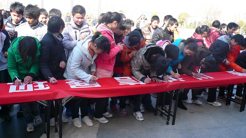三是轰轰烈烈开展诚信考试承诺万人签名活动。我区各校在认真学习《告考生及家长一封信》、《国家教育考试违规处理办法》(节选)、《诚信考试承诺书》的基础上,各校制作励志宣传条幅、购买专用签名用笔,组织学生庄严隆重的进行诚信考试承诺签名活动。教育局副局长、学校校长、年级主任参与宣传动员。考生签名后的横幅将集中悬挂在我区的三个考点,持续鞭策激励学生,约束学生的考试行为,烘托考点考试气氛,营造优良考试氛围。